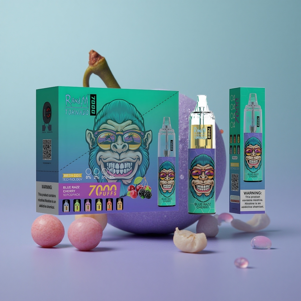 RandM Fumot Tornado 7000 דובדבן ראז כחול עם סוללה 850 ושנאי רשת